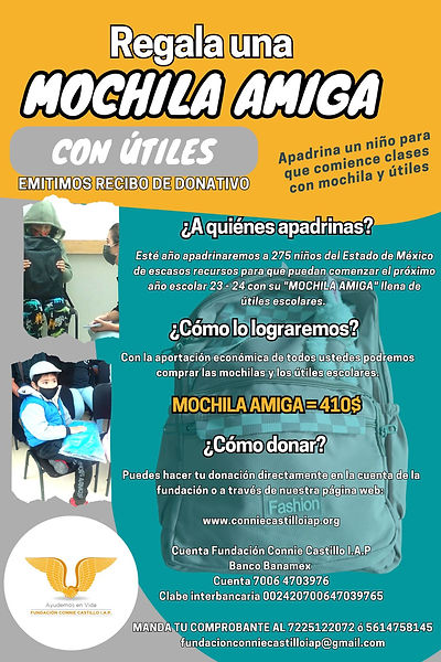 Con la aportación económica de todos ustedes podremos comprar las mochilas y los útiles escolares. Cada mochila amiga tiene un costo de $410.